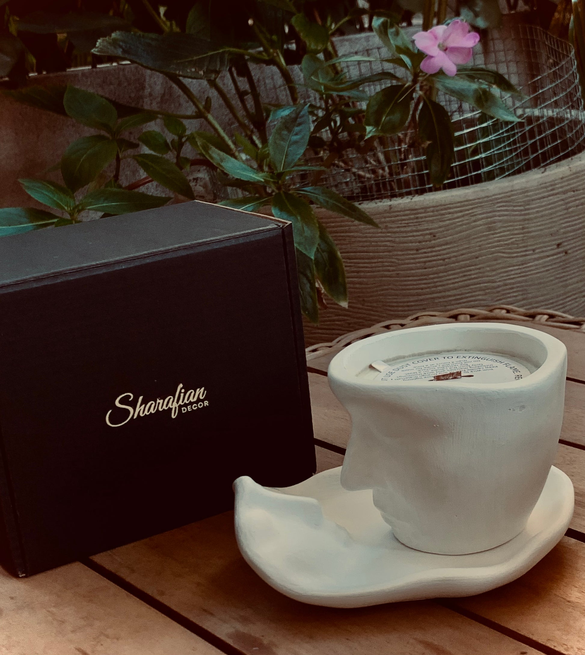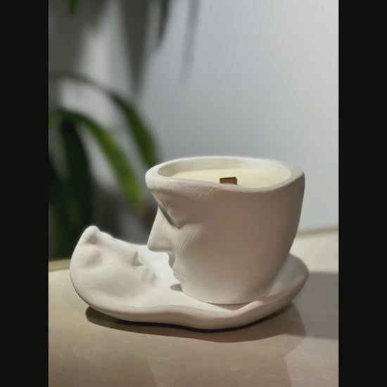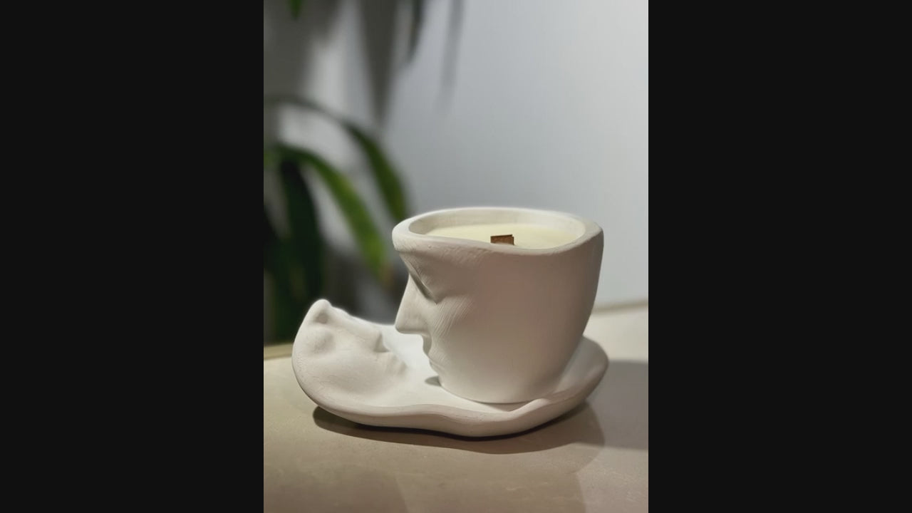 Add a touch of modern artistry and calming fragrance to your home with this handmade aroma candle, designed in a gypsum container shaped like an abstract human face resting on a sculpted base.